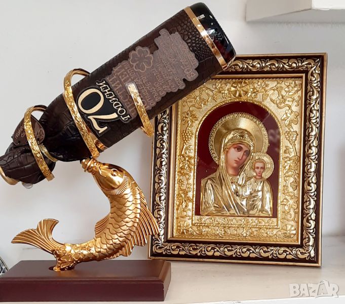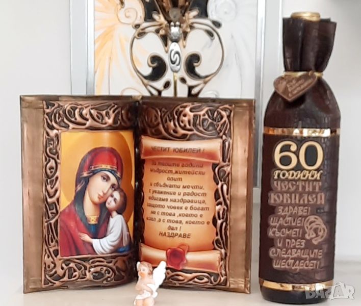 Предлага се индивидуално или в комплект с апликирана с кожа във формата на торбичка, бутилка със златни цифри и плочка с пожелание за съответния повод - 80, 50, 60, 70 или 75 години.