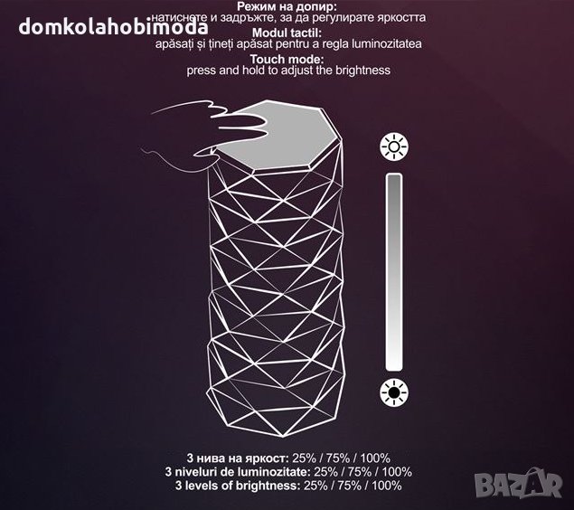 Има сензорна функция и 3 нива на яркост (25%, 75%, 100%). Натиснете и задръжте, за да регулирате яркостта. Подходящ за всекидневна, кабинет или спалня.