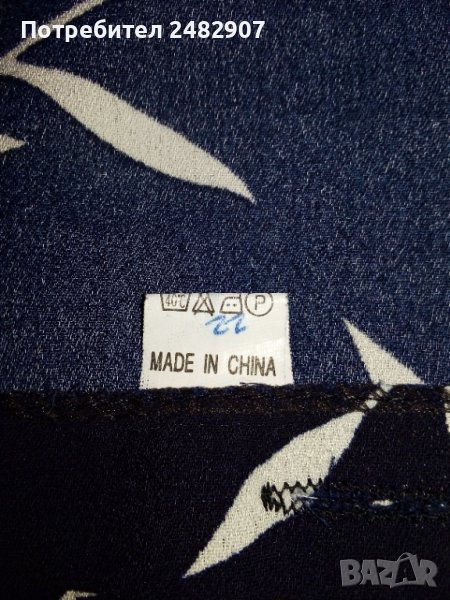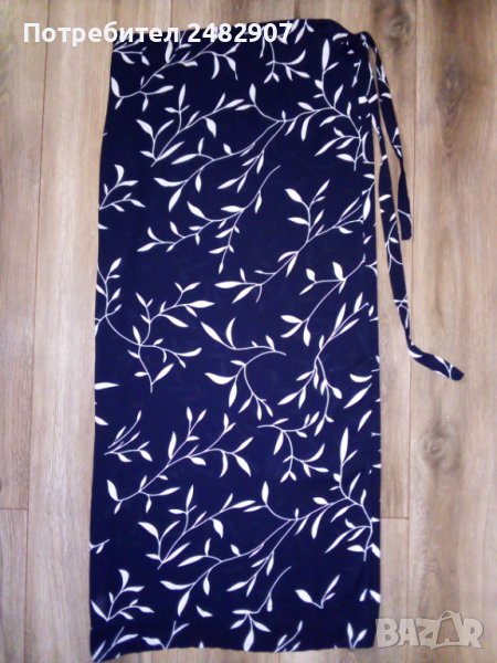 Дълга дамска пола, тип "Прегърни ме" от немачкаем копринен плат в тъмно синьо и бяло, с флорални мотиви. Съдържа 100 % полиестер и връзки в талията. Дължина - 93 см, ширина изцяло - 130 см. Много запазена, почти не е използвана, отлично състояние, без забележки.