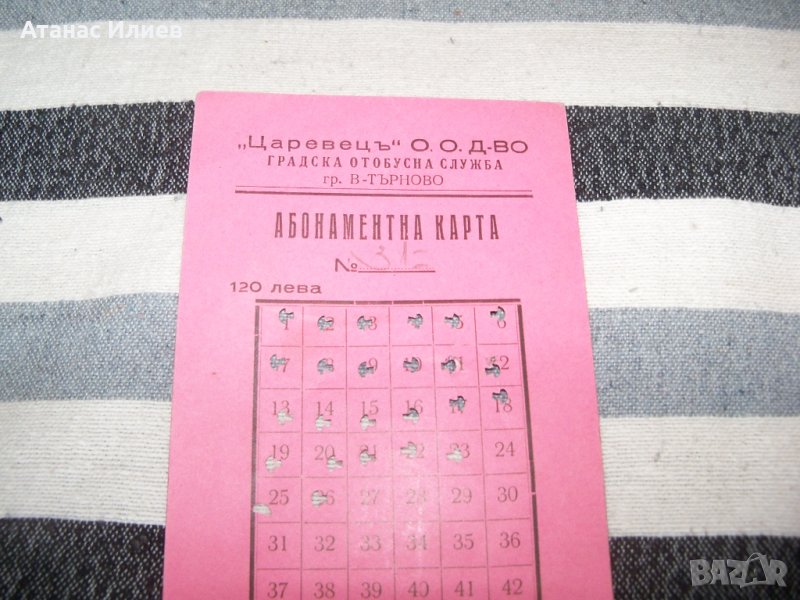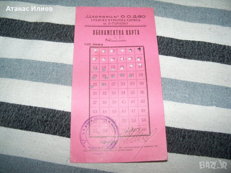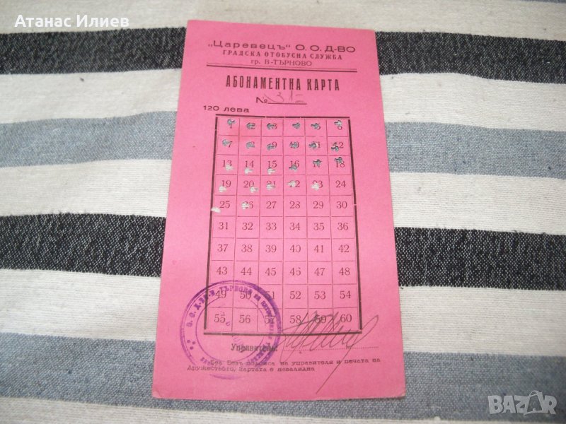 Стара карта за пътуване с градски транспорт по една от първите градски автобусни линии в България. Картата е издадена от градската отобусна служба в гр. Велико Търново - "Царевецъ" О.О. Д-во. вероятно през 1939 - 40 г. Картата е в много добро състояние. Уникат!
