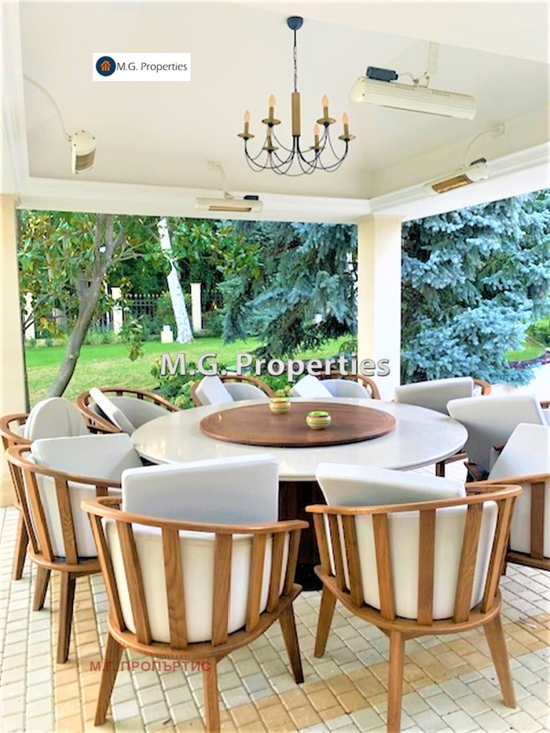 Дворът е красиво озеленен с изградена поливна система, басейн с отопление и система за филтрация и почистване на водата без химикали, сауна, външна баня с тоалет. Има лятна кухня и покрита беседка с инфрачервено отопление.