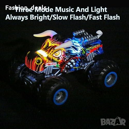 Вградени три режима на светлини и динамична музика, Осветете действието с ярките LED светлини, които украсяват нашия автомобил чудовище. Независимо дали е на закрито, или на открито, ослепителният LED дисплей подобрява преживяването от играта, създавайки хипнотизиращ спектакъл.