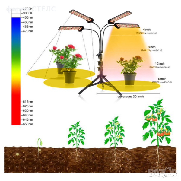 Безкрайно близо до естествената слънчева светлина. Тези светлини има 5 нива димиране и 3 режими (червена светлина / бяла светлина , червено / топло бяла светлина) . Светлина може да предложи пълен спектър от 460-625nm до 3000k и растението може да абсорбира всички светлини, от които се нуждае. Червената светлина насърчава цветето, плодовете, растежа на листата.