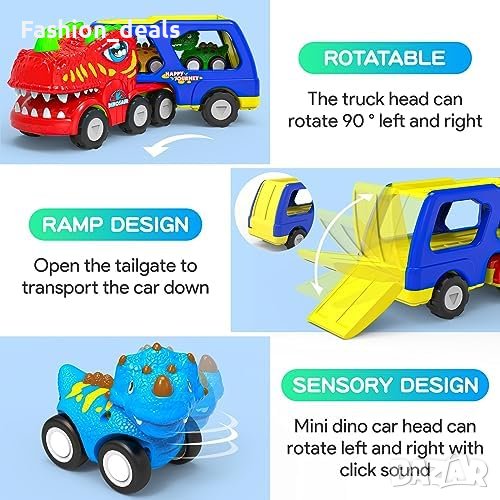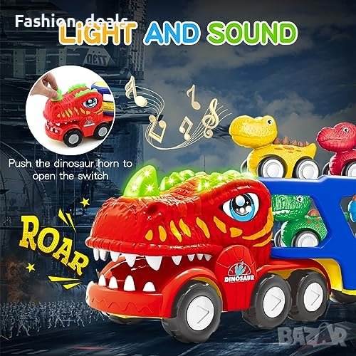 Притиснете рогата на динозаврите надясно, за да чуете реалистичния звук на сирената и да видите ярките мигащи светлини, което е много привлекателно. Звуците на колите-играчки продължават само около 8 секунди, няма нужда да се притеснявате, че са прекалено шумни.