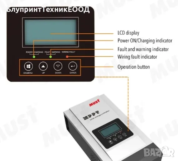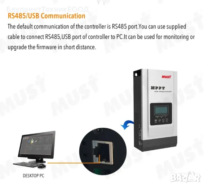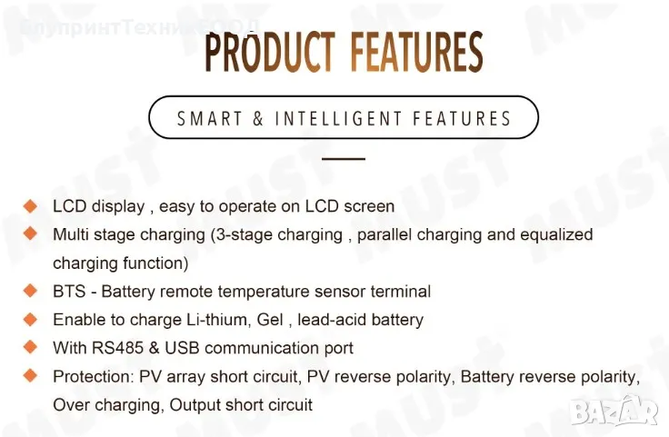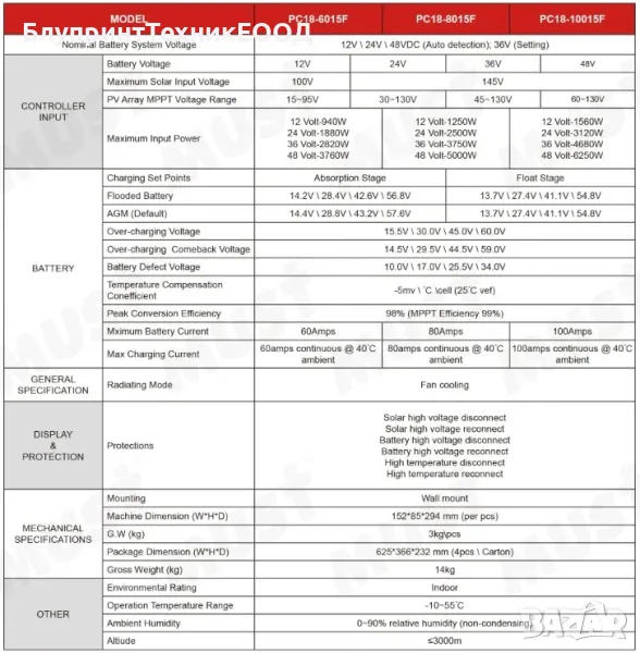 Поддържа разнообразие от типове акумулатори, включително оловно-киселинни (AGM, GEL, Flooded) и литиеви (LiFePO4, Li-ion), както и потребителски избор на стойностите. Устройството поддържа максимално входно напрежение от фотоволтаиците до 145V за 24/36/48V системи и до 100V за 12V системи, което го прави подходящо за работа с панели с по-високо напрежение. Соларният контролер е снабден с LCD дисплей, който предоставя детайлна информация за работата на системата, а чрез бутоните под него осигурява достъп до всички възможни настройки. Изходът му към консуматорите може да осигури до 100A ток и не подлежи на контрол, а само подава информация за текущата консумация на дисплея. Дава възможност за свързване с компютър чрез кабела в комплекта, а приложението можете да свалите от раздел DOWNLOAD на сайта ни.