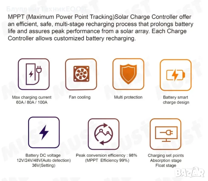 Соларният контролер Must PC18-10015F е високоефективно устройство, базирано на технологията MPPT (Maximum Power Point Tracking). Той позволява максимално ефективно преобразуване на слънчевата енергия, като осигурява проследяване на точката на максимална мощност на соларните панели. Контролерът е съвместим със системи с напрежение 12V, 24V, 36V и 48V.