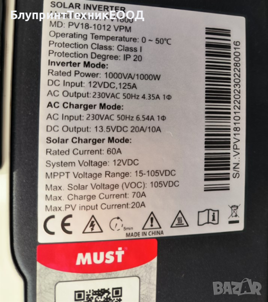1000W 12V UPS/Комбиниран инвертор MUST със 60A MPPT соларен контролер PV18-1012VPM