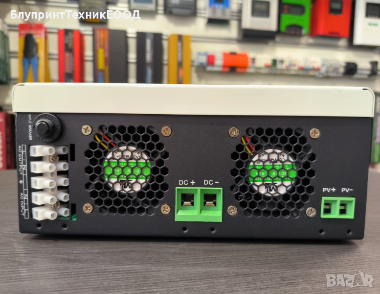Това устройство условно съчетава в себе си мрежово и соларно MPPT зарядни устройства, инвертор и общ програмен блок, предлагащ богат избор от настройки - около 30 позиции, чрез които потребителя задава необходимите му параметри и алгоритъм на работа. Те се въвеждат от бутоните под дисплея или чрез WI-FI комуникация през интернет (ако WI-FI модула се закупи допълнително). Чрез него можете и да наблюдавате работата на системата отдалечено – соларен добив, текуща консумация и много други данни. Комбинира източниците на захранване в избраната от потребителя последователност. Предлага работа само като непрекъсваем източник на захранване (UPS), или може да осигурява захранване на места без връзка със електропреносната мрежа. Дава възможност за избор на източник за зарждане на батериите – слънце/мрежа/комбинирано. Буферира през акумулаторите (без да ги циклира) енергията от фотоволтаиците и я подава към консуматорите. Различното при този модел е, че работи със ниско напрежение от соларните панели и може да поеме по-голям входящ ток. Тук MPPT диапазона е 15-105V. Това дава възможност за инсталиране на няколко фотоволтаични панела или групи с еднакви или близки параметри с различен наклон и ориентация. Максималната оползотворяема мощност от фотоволтаиците е 900W, a максималната им инсталирана мощност може да бъде до 2100W. По този начин можете да си осигурите сигурен добив от 700-900 вата от сутрин до късен следобяд, дори и при относително лошо време. Този модел е удачен основно за островни или UPS системи. Много практичен е и за жилищни сгради, които позволяват инсталиране само на един -два фотоволтаика, дори ориентирани в различна посока. Обърнете внимание, че този модел не може да смесва соларна и мрежова енргия. Тази функция я предлагат основно високоволтови хибридни инвертори (400-450V от PV) с нисък ток от PV (до 12-13А за 12V системи). При тях всички панели се свързват последователно и се ориентират в една посока, като се цели фотоволтаичния масив да бъде с високо напрежение, заради диапазона на MPPT контролера, например 60-360V. Можете да дублирате два източника на захранване посредством различни автоматични или ръчни превключватели. Така ще можете да избирате от къде консуматорите или инвертора да черпят мощност – мрежа, генератор, инвертор или друг източник на захранване.