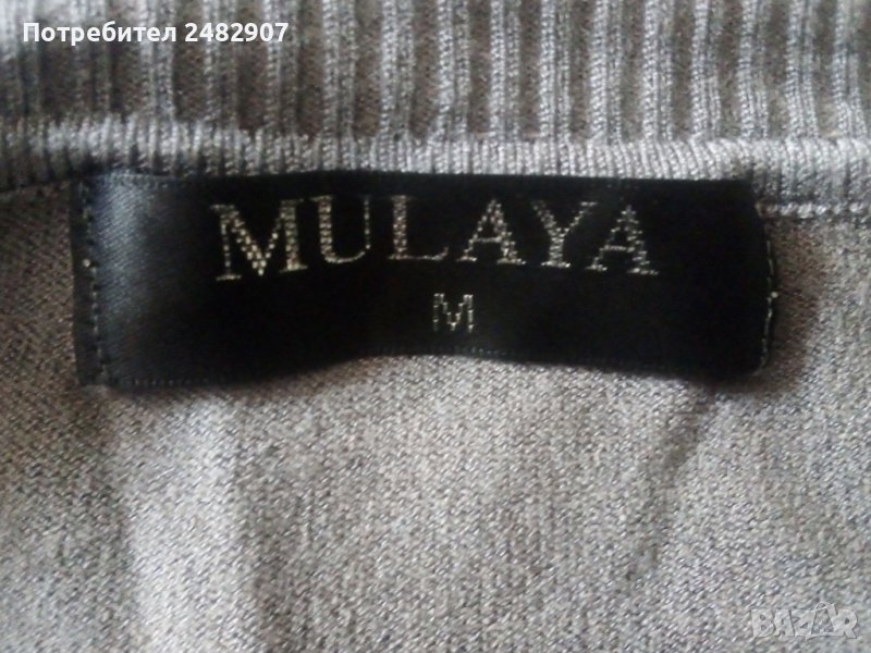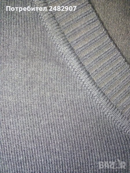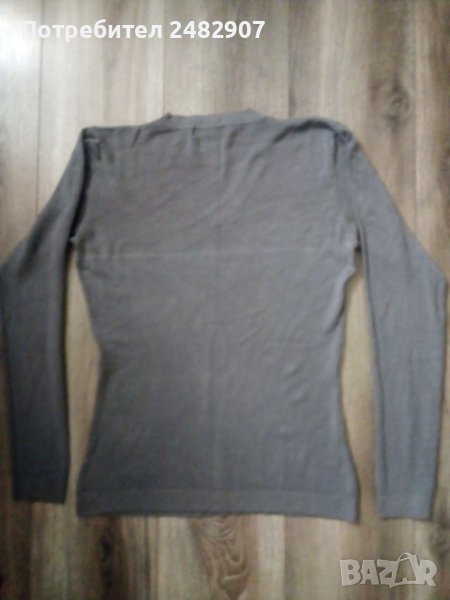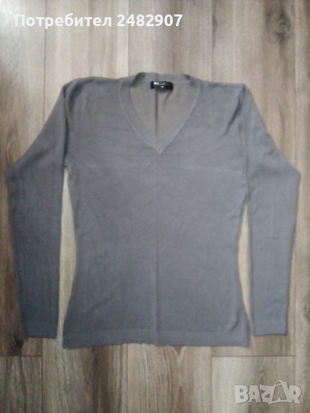 Сива дамска, машинно плетена блуза с остро деколте, размер М. Ширина в раменете - 40 см, ширина под мишниците - 47 см, ширина в долната част - 44 см, дължина от рамото до долу - 63 см, дължина на ръкава от рамото - 63 см. Много запазена, почти не е използвана, много тънка и мека, без забележки.