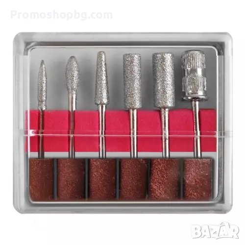 КОМПЛЕКТ ФРЕЗИ - комплектът включва набор от 6 диамантени фрези и 6 шлифовъчни приставки - всичко необходимо за премахване на хибриден лак, гел, или акрил, за шлифоване и почистване на ноктите, и др.