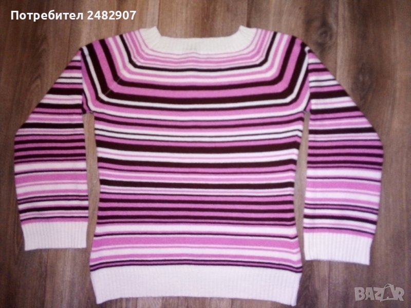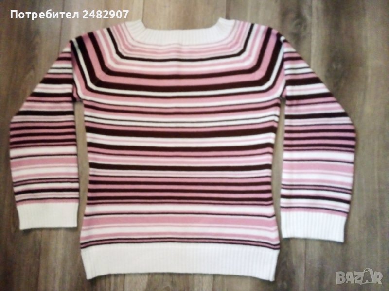 Машинно плетена дамска блуза в бяло, розово и кафяво, размер М. Ширина под мишниците - 46 см, ширина в долната част - 40 см, дължина от рамото до долу - 58 см, ширина на ръкава в долната част - 13 см. Много запазена, почти не е използвана, отлично състояние, без забележки.