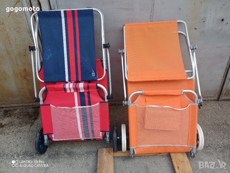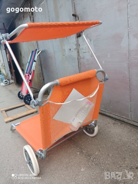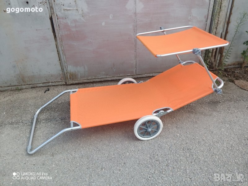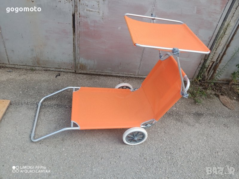 ШЕЗЛОНГ КОЛИЧКА за плажшезлонг на колела за плажа, алуминиев сгъваем стол. Всички данни са на снимките.Моля вижте фото. Цената е за брой шезлонг на колела.Добре запазен