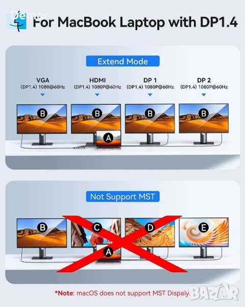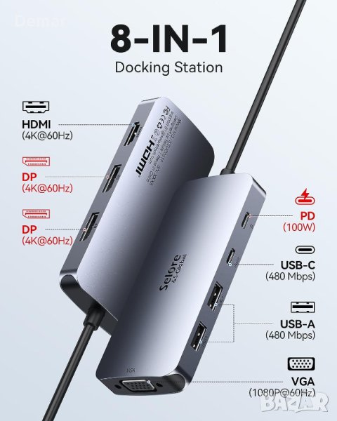 Изпитайте повишена производителност с докинг станцията 8 в 1 за троен дисплей. Този адаптер за няколко монитора разполага с двоен DisplayPort и 1 HDMI изход, позволяващ тройни дисплеи до 4K видео резолюция. Идеален за лаптопи с USB-C или Thunderbolt 3/4 портове, той предлага набор от портове, включително 24K@60Hz DP, 14K@60Hz HDMI, 1*1080P VGA, PD порт (макс. 100W), 2 USB 2.0 порта и USB C 2.0 порт. Моля, имайте предвид, че потребителите на MacBook ще имат огледални дисплеи, когато са свързани. USB C хъбът поддържа бързо зареждане на лаптоп със 100 W PD USB C порт за зареждане. Той е многофункционален и съвместим с различни устройства, което го прави перфектен за безпроблемна офисна настройка.