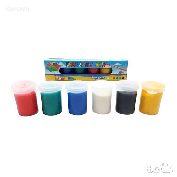 Темперни боички, 6 цвята в комплект. Боите са направени на базата на естествени съставки и висококачествени пигменти. Боите са в пластмасови, запечатани бурканчета с винтова капачка. Имат добра скриваща способност, наситеност на цвета и чистота. Смесват добре помежду си, създавайки нови чисти нюанси. Темперните бои са основно помагало в учебният процес в часовете по рисуване, предназначени за детско творчество.