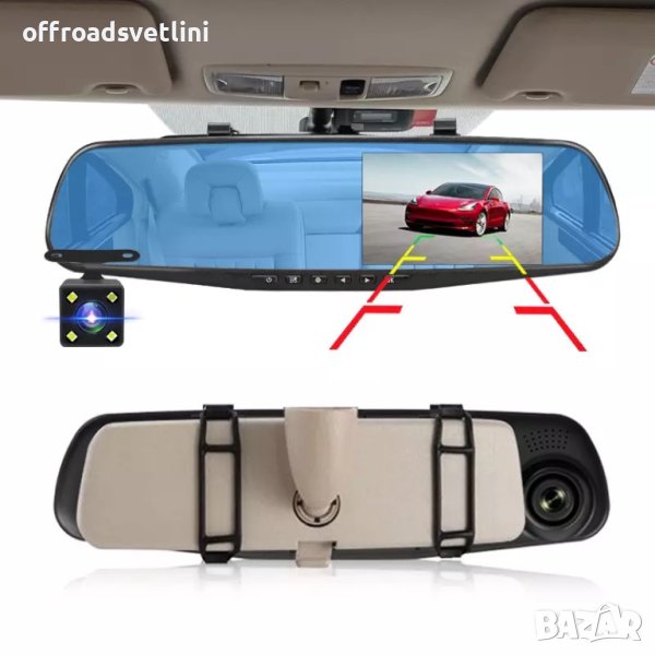 Авторегистратор видеорегистратор за автомобил с две камери предна и задна + огледало с монитор Full HD 1080P и 32 GB Micro SD Card карта с памет 12V - 24V