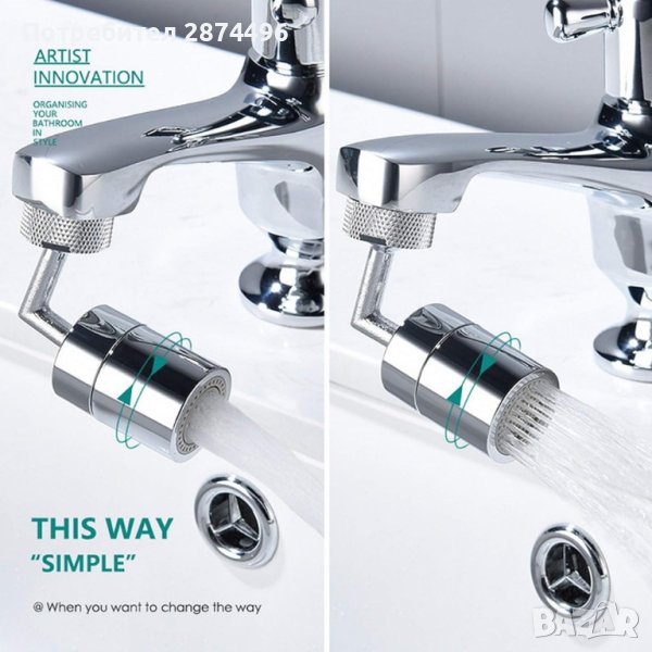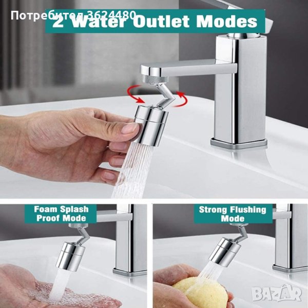 Подвижен накрайник за чешма с въртящ се механизъм на 720 градуса: Главата на крана се върти на 720 °, краищата се движат, ъгълът е широк и гладък, улесняващ измиване на лице и гаргара. Регулирайте ъгъла на крана за улеснено почистване на съдове, плодове и зеленчуци. Накрайникът има 2 променящи се режима струата на водата: директна струя и разпръскване.