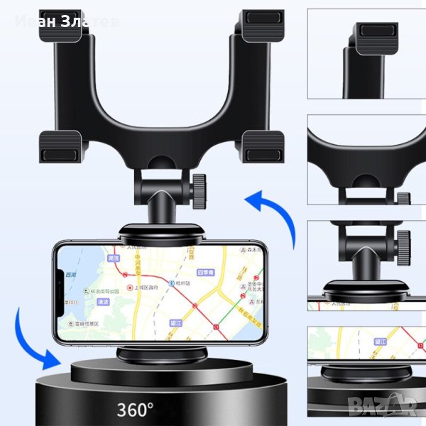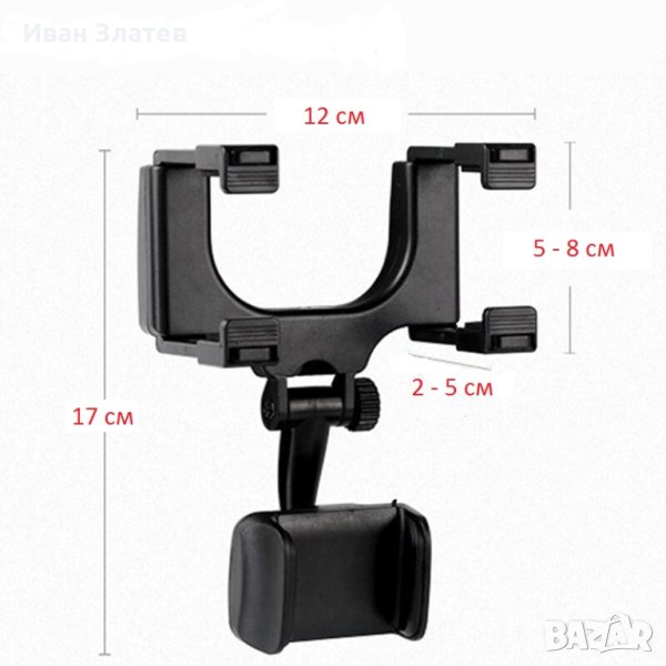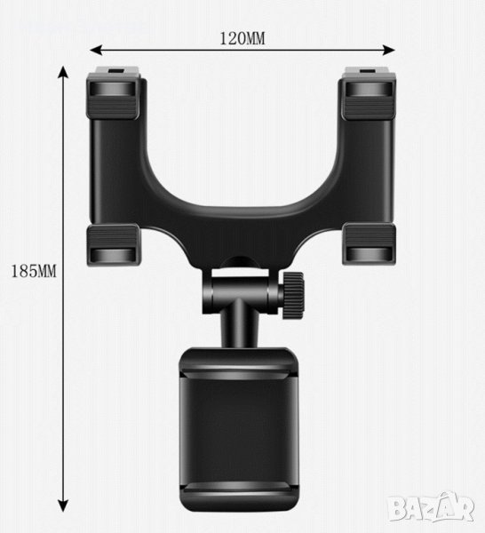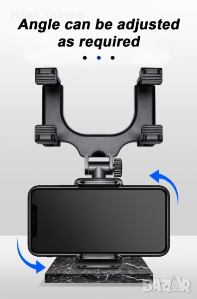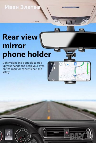 Стойката за телефон за автомобилно огледало дава възможност да прикрепите устройства с ширина между 5 и 9 см, под огледалото за обратно виждане, като може да следите едновременно дисплея на мобилното си устройство и да шофирате безопасно. Особено удобно когато имате нужда от навигационни устройства, които да ви указват посоката на движение. Поставката има възможност за завъртане на 360 °, което ви дава възможност да изберете подходящ ъгъл, който е най – удобен за вас. За направата на поставката са използвани нов вид ABS материали, които са екологично чисти и имат висока издръжливост при резки температурни промени, които могат да възникнат във вашия автомобил, когато той е оставен продължително време на открито при различни атмосферни условия. Поставката има практичен и олекотен дизайн, който е стабилен, но не натоварва огледалото за странично виждане с излишно тегло.