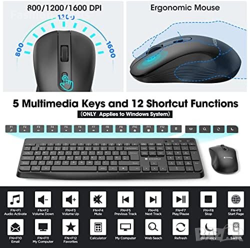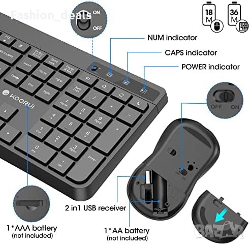 - Енергоспестяваща функция: Активира се след 10 минути неактивност, което удължава живота на батериите до 36 месеца за клавиатурата и 18 месеца за мишката.