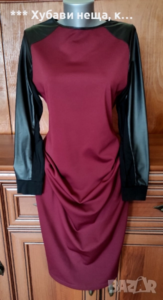 Рокля цвят вишна с кожени ръкави: Много красива с уникална кройка, комбинация от трико и така актуалния плат с кожен ефект. Цвят вишна. Елегантна и удобна. Изработена е от еластично трико като ръкавът е от черно трико комбиниран с плат с кожен ефект. Може да се комбинира с падащо кожено коланче. Еластична е и кройката позволява и прикрива някои несъвършенства на фигурата. След пране няма нужда да се глади.