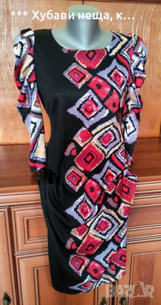 Рокля с едностранен геометричен принт: Принтът е фигурален, интересно очертаващ от едната страна релефни фигури на черна основа. Модел - тип молив. Материята е еластично, плътно, стегнато трико. мека, лека, пере се без гладене, съхне бързо. Цена 25 лв.