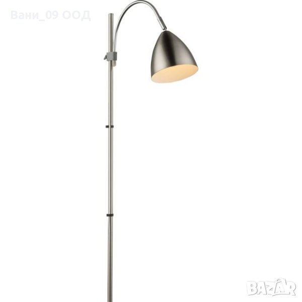 Подова лампа, която съчетава по много интересен начин класическа визия с модерно присъствие. Силуетът поставя фин акцент в пространството, изработен от никелов матов метал с абажур тип камбанка и регулируема височина (макс. 156 см). Свързващият 3-метров кабел с ключ за включване и изключване позволява гъвкавост и лесно преместване.