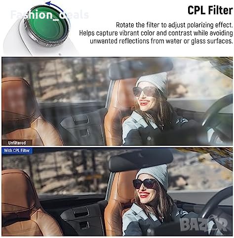 Включеният в комплекта филтър с кръгов поляризатор (CPL) намалява отблясъците и нежеланите отражения от повърхности като вода и стъкло, като подобрява яркостта на цветовете. UV филтърът служи не само за физическа защита на обектива, но и предотвратява влиянието на прах, драскотини и удари върху качеството на изображението.