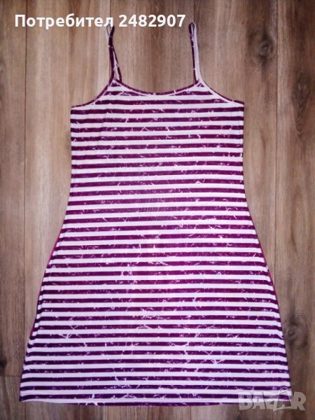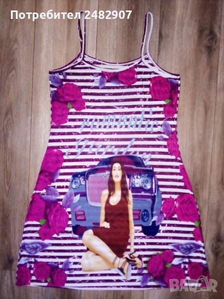 Къса дамска лятна рокля в бяло и бордо, с флорални мотиви, размер М. Съдържа 95 % полиестер и 5 % еластан. Ширина под мишниците - 42 см, ширина в долната част - 65 см, дължина от горната част на презрамките до долу - 90 см. Много тънка и ефирна, с блестящи камъчета отпред.
