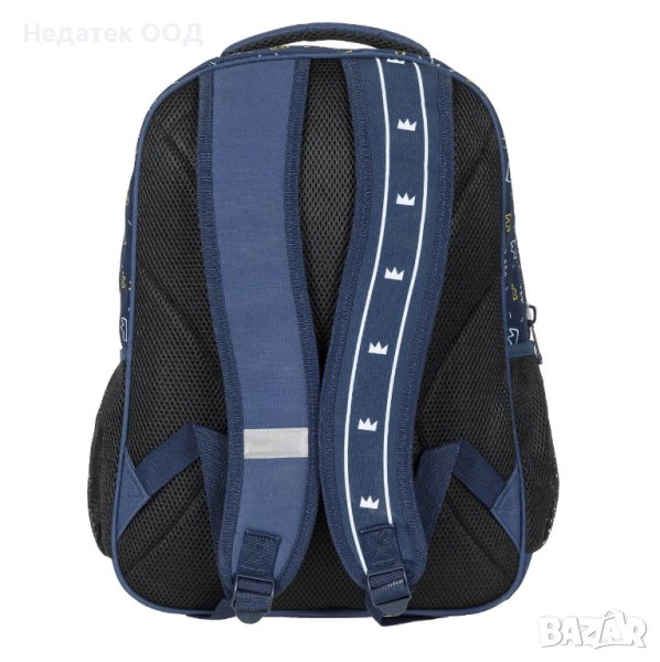 Тъмносиня ученическа чанта с дизайн Fall Guys. Има 2 отделения и 1 голям джоб. Има издръжливи сини ципове, мек гръб и регулируеми презрамки.