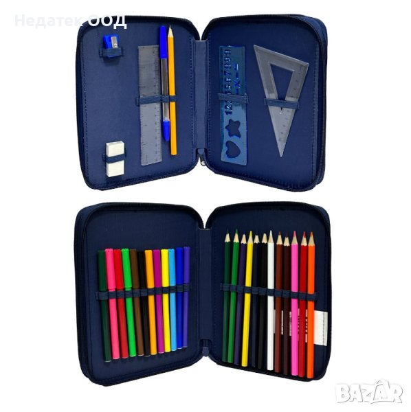 Съдържа молив и син химикал, пластмасова гума, гума, 3 прави линийки 15 см, права с шарки 15 см и триъгълник 10 см, 12 боички и 12 маркера.