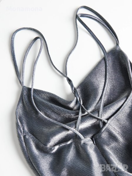 Уникална сребриста парти рокля от вискоза с гръцко деколте, тънки преплетени отзад презрамки и гол гръб. Нова, без етикет. За всякакви поводи. Свободен модел, става за различни размери. Купена за 90 лв.