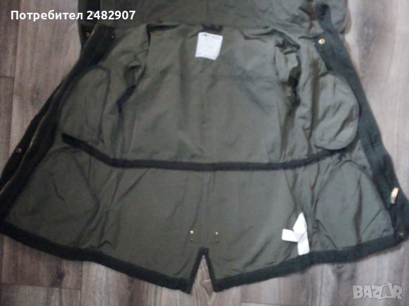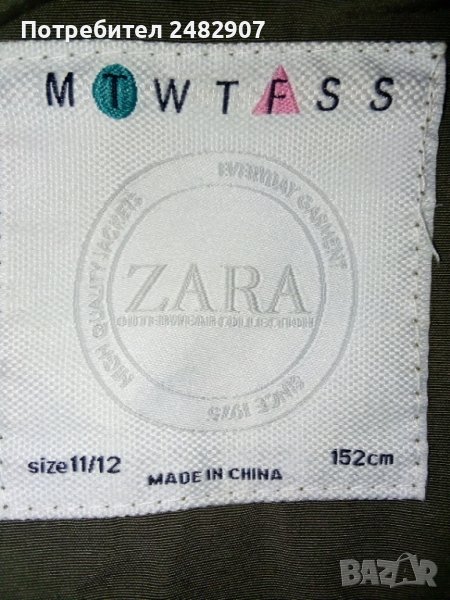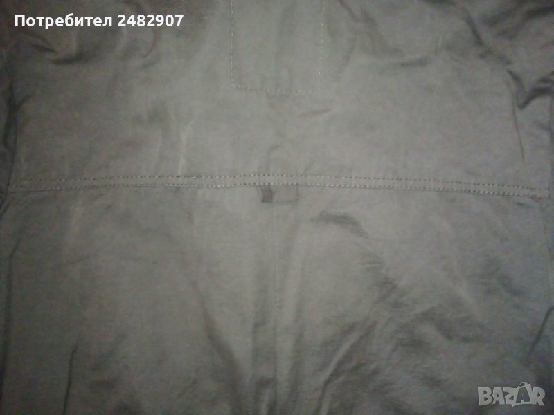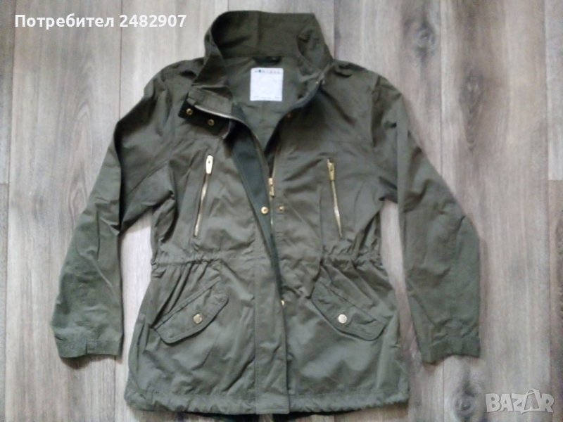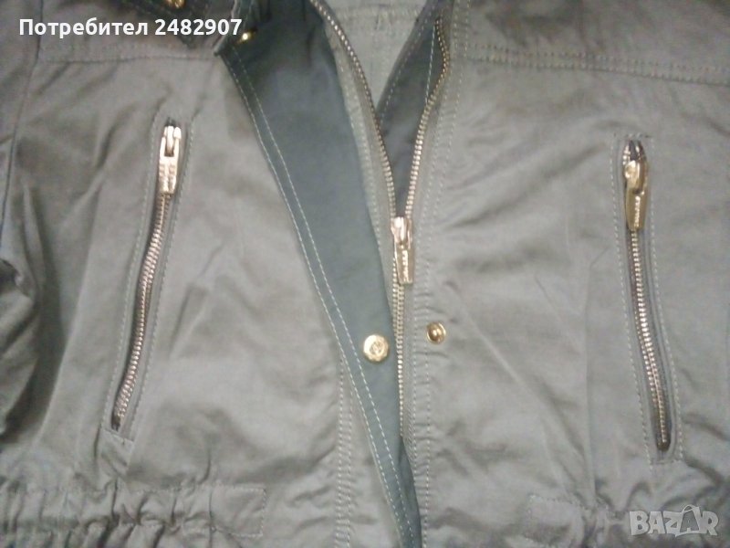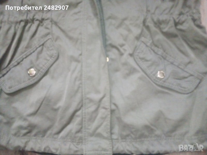 Детско преходно яке за момиче в маслено зелен цвят. Ширина в раменете - 40 см, ширина под мишниците - 46 см, ширина в долната част - 53 см, дължина от рамото до долу - 65 см, дължина на ръкава от рамото - 54 см, ширина на ръкава в долната част - 12 см. Чисто ново, не е използвано, с връзка от вътрешната страна на талията, закопчаване с цип и тик-так копчета, 4 джоба отпред - два горе и два долу.
