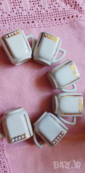 Порцеланов сервиз за греяна ракия от 60-те години на миналия век. Отлично състояние, няколко фабрични забележки, няма счуване, пукнато, няма кракле. Прекрасно винтиж състояние. Чашките и каничката са с различна маркировка.