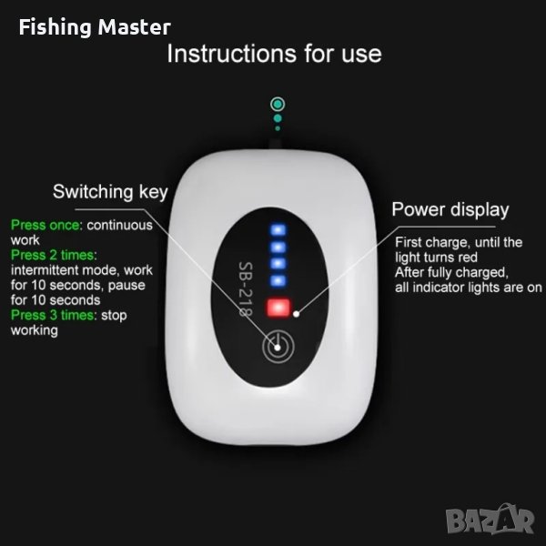 Помпичка за въздух за жива стръв. С този компактен преносим компресор можете да подавате въздух на стръвта или уловената риба в кофата си, за да остане жива при продължителен трапорт и по време риболовния излет.