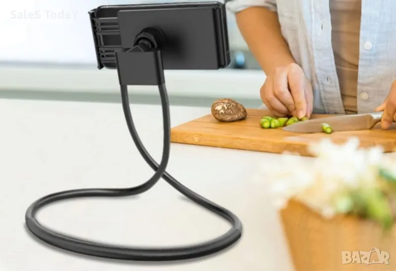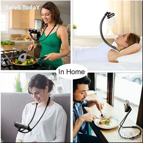 Регулируем калъф за мобилен телефон за свободни ръце с мека яка, подходящ за устройства до 18 см. Огъва се и се адаптира към врата или друга повърхност. Идеален за почивка, филми, пътуване, готвене, тренировка, видео разговори и др.