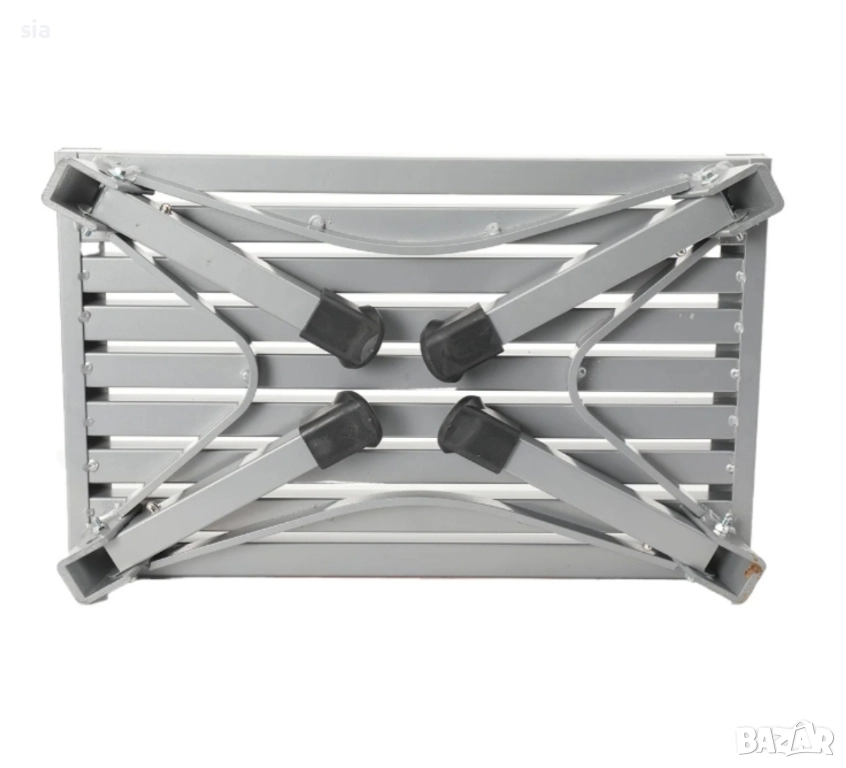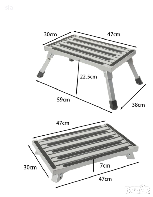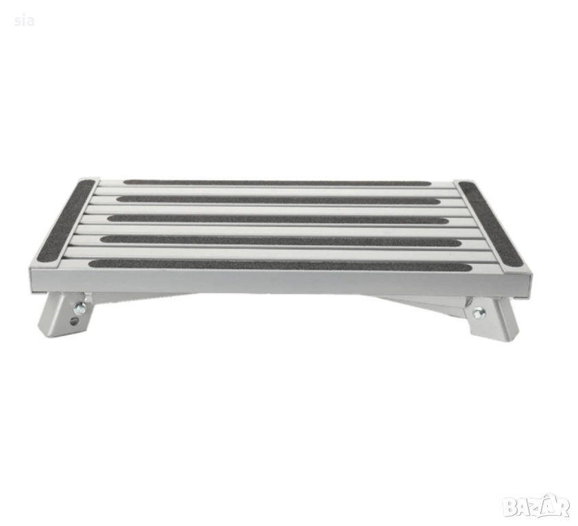 Горната повърхност е оборудвана с антислип ленти, осигуряващи стабилно стъпване при сухи и мокри условия. Краката са снабдени с гумирани накрайници, което предотвратява приплъзване върху различни настилки. Механизмът за сгъване позволява степенката да се прибере компактно до височина само 7 cm, което я прави идеална за транспорт и съхранение.Технически характеристики: