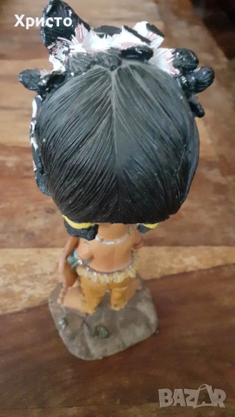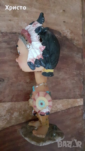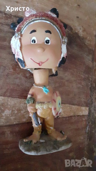 Продавам фигура млад индианец с мърдаща глава, декорация. Главата е върху пружина и като се клати продължително. Весела и забавна играчка. Тук-там е наранена, но това и носи допълнителен чар. Висока 17 см, основа 6х6 см, не е керамична, а от някакъв твърд и масивен материал наподобяващ пластмаса. Стои си стабилно.