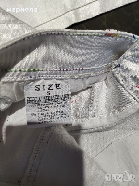 отличен с нормална талия с цветни шалове отстрани на джобовете долу по края навсякъде с нежно бяло без забележки има лека разтегливост и стои много ефектно
