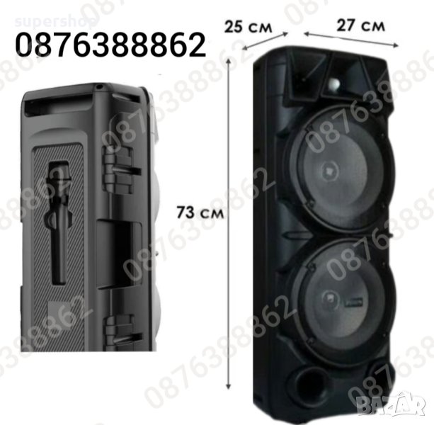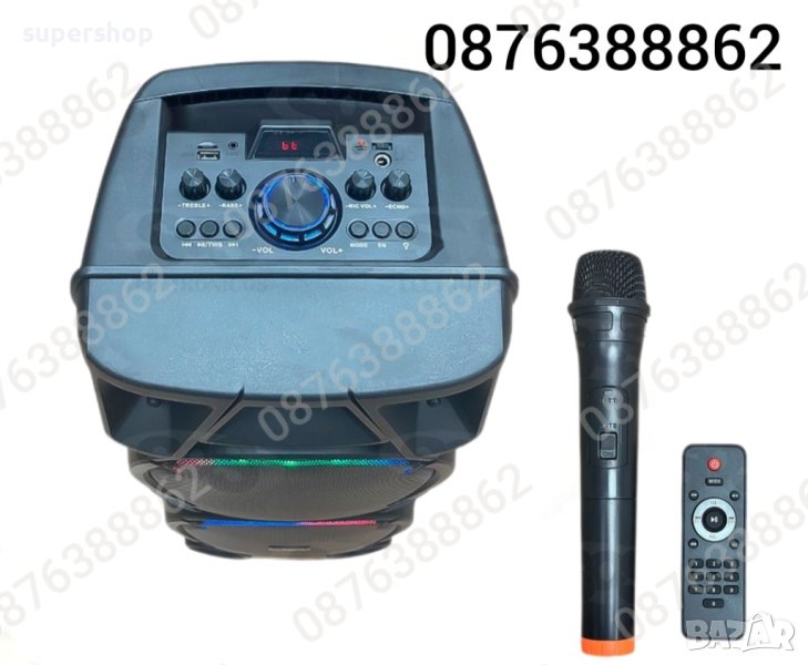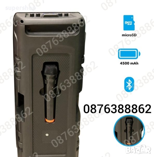 Караоке колоната е с вграден акумулатор, МP3 плеър от SD карта или флашка и безжичен микрофон за караоке и радио.