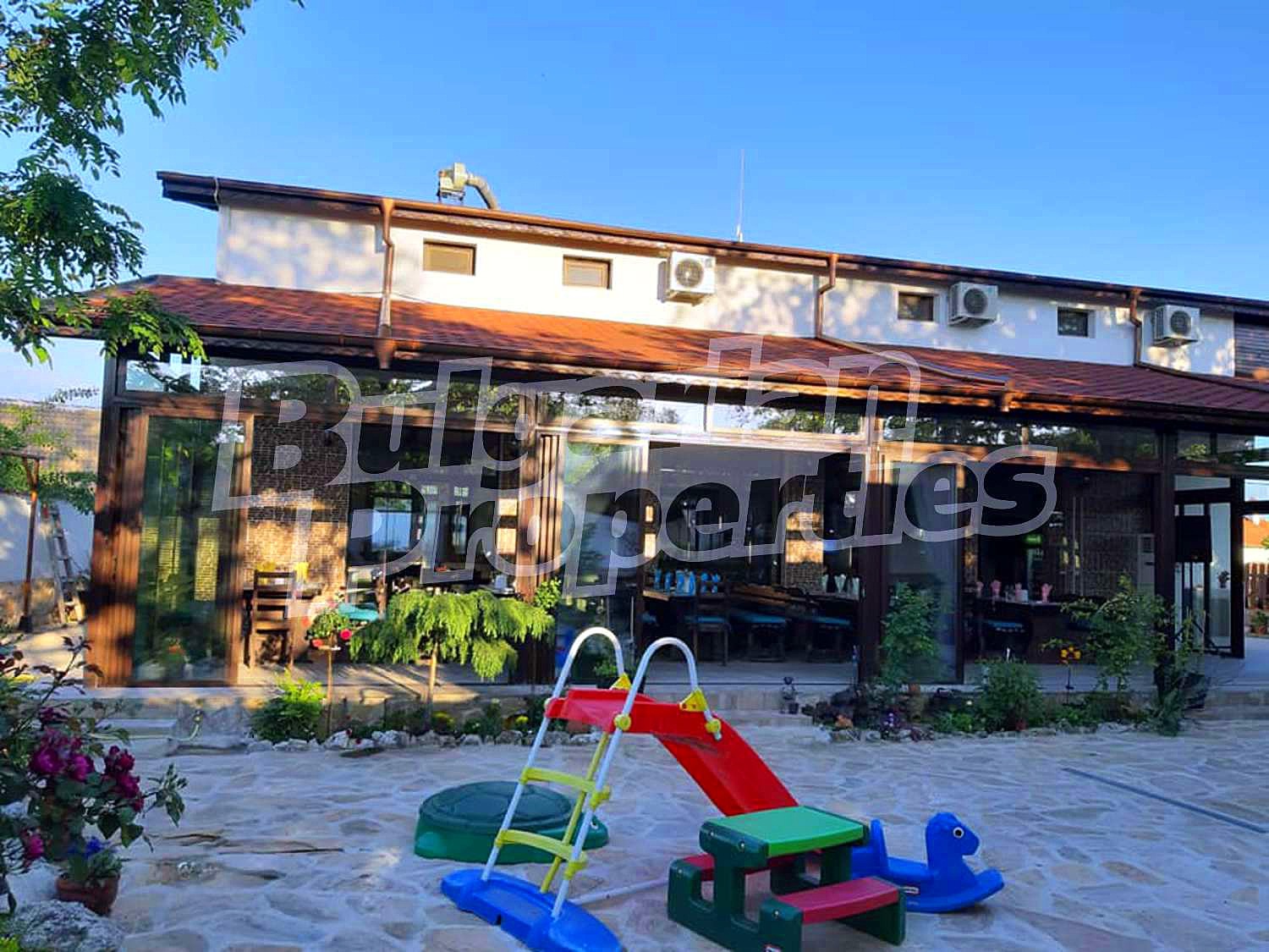 На първия етаж е разположен напълно обзаведен и оборудван, добре разработен ресторант с отлична кухня, професионални електроуреди и прибори. Самият ресторант се състои от две зали, разделени с плъзгащи стъклени врати. Има бар и складово помещение. Във всички помещения са изградени вентилационни и климатични системи. През летния сезон гостите могат да бъдат настанявани на открито, в просторна и озеленена градина с навес, градинска мебел и водопадче.