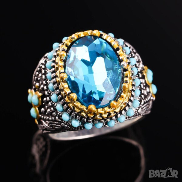 Мъжки пръстен със син циркон и тюркоази → Обява 41996821