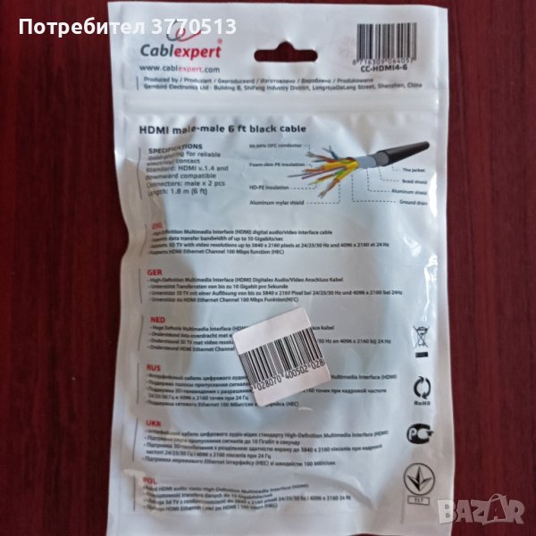 Кабел HDMI - 19 pin; 1,8 m., снимка 1 - Приемници и антени - 42001836 Кабел HDMI - 19 pin; 1,8 m., снимка 2 - Приемници и антени - 42001836 Кабел HDMI - 19 pin; 1,8 m., снимка 3 - Приемници и антени - 42001836 1/3
