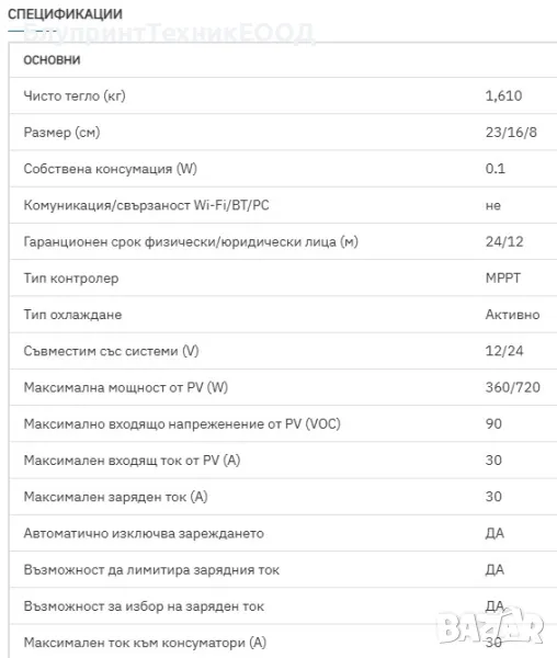 30А Соларен MPPT контролер 12/24V с контрол на зарядния ток