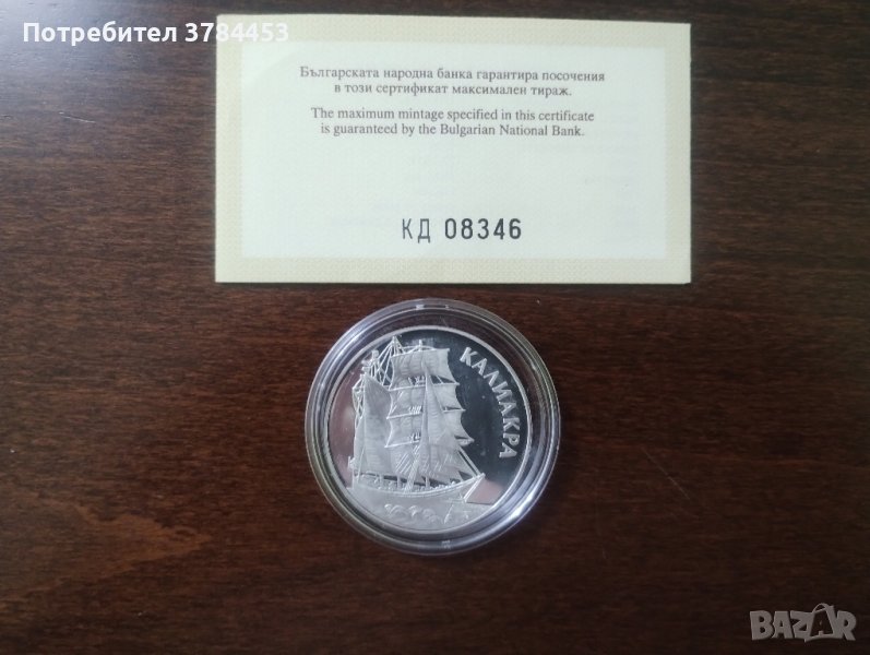 Рядка българска сребърна монета "Ветроходът Калиакра" със сертификат за автентичност от БНБ.Сребро проба 925,тегло 23,33 грама.