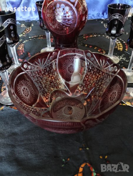 Красив винен сервиз от цветно румънско стъкло, включващ бутилка 33см. с тапата., шест чаши 16.5 см. с вместимост 200мл. и голяма купа 10.5/20см. Чашите са в по тъмно червено.Минимална люспа на ръба на гърлото на бутилката.
