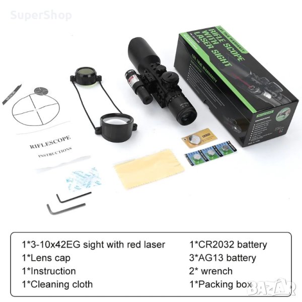Професионална оптика с лазер за въздушна пушка – бързомерец оптически мерник прицел оптика за оръжие M9 3-10×42 с плавно приближаване и увеличение от 3 до 10 пъти, избор на червен или зелен мерник с регулиране на яркостта и червен лазер бързомер за еърсофт, пистолет, въздушна или