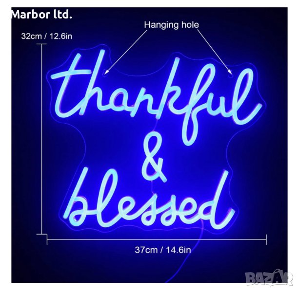 LED неонов надпис Thankful and Blessed за стена. 2 метра USB кабел, куки и верижка за окачване на стена.