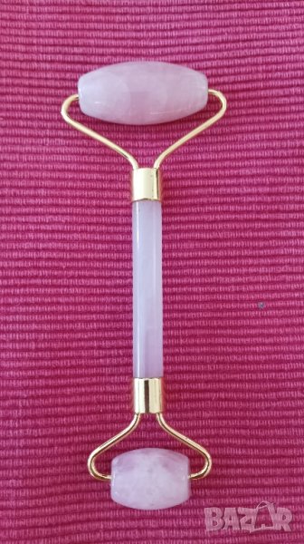 Двустранен масажен ролер за лице от розов кварц.