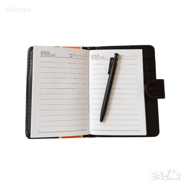 Малко джобно тефтерче с кожени корици, които имат закопчалка. Към тефтерчето има и малка химикалка, пишеща в синьо мастило. Този джобен тефтер ще се побере във всяка чанта и е идеален за записки и отбелязвания на важни дати, където и да се намираш.