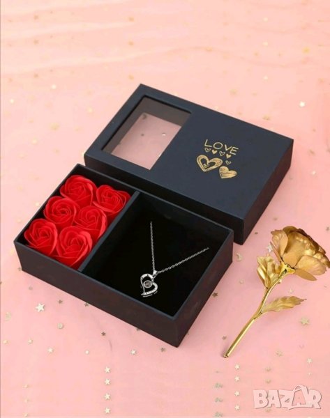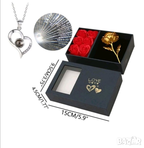 - Луксозен подаръчен комплект с колие, прожектиращо ОБИЧАМ ТЕ на 100 езика, 6 вечни червени рози, 1