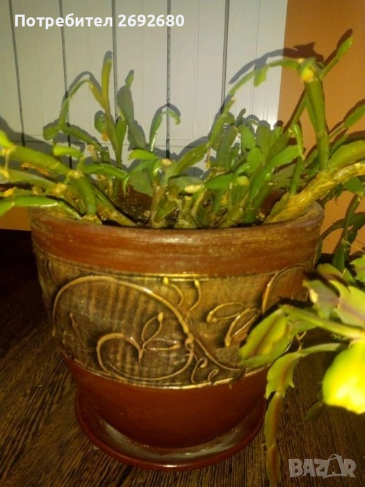 Кафявата саксия не е нова, има забележка - на места олющена от времето боя, други забележки като пукнатини и тем подобни няма, много е запазена, към нея също има подложка в комплекта, размери на тъмно-кафявата саксия: височина 20см., диаметър - 23см. Цена на кафявата саксия заедно с розови коледничета в нея - 8евро.